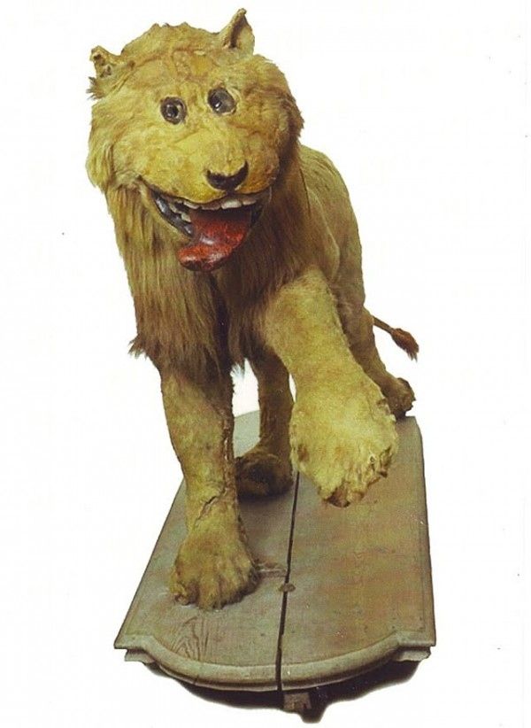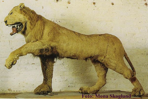 | В 1731 году из Африки был выслан убитый лев, чтобы из него можно было сделать чучело. К сожалению, плоть животного не выдержала долгой поездки, и до Стокгольма доехала только шкура и кости. Таксидермист, который делал чучело, никогда не видел этого экзотического животного, но он постарался на славу. |